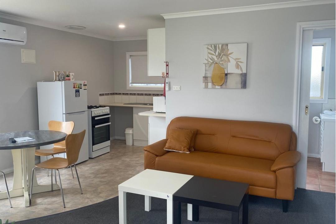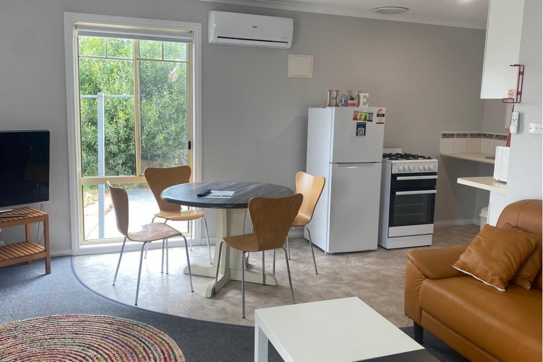 Inside, you'll find two bedrooms, a queen room and a spacious bunk room (four singles) comfortably sleeping six guests, along with one modern bathroom. The cottage offers a full kitchen with a large fridge, oven, microwave, and stove, and the living area is cooled by reverse-cycle air conditioning. Enjoy evening conversations by the fire pit or use the BBQ in the inviting outdoor space wrapped in greenery. Games, board games, and a 50" flat-screen TV provide evening entertainment.